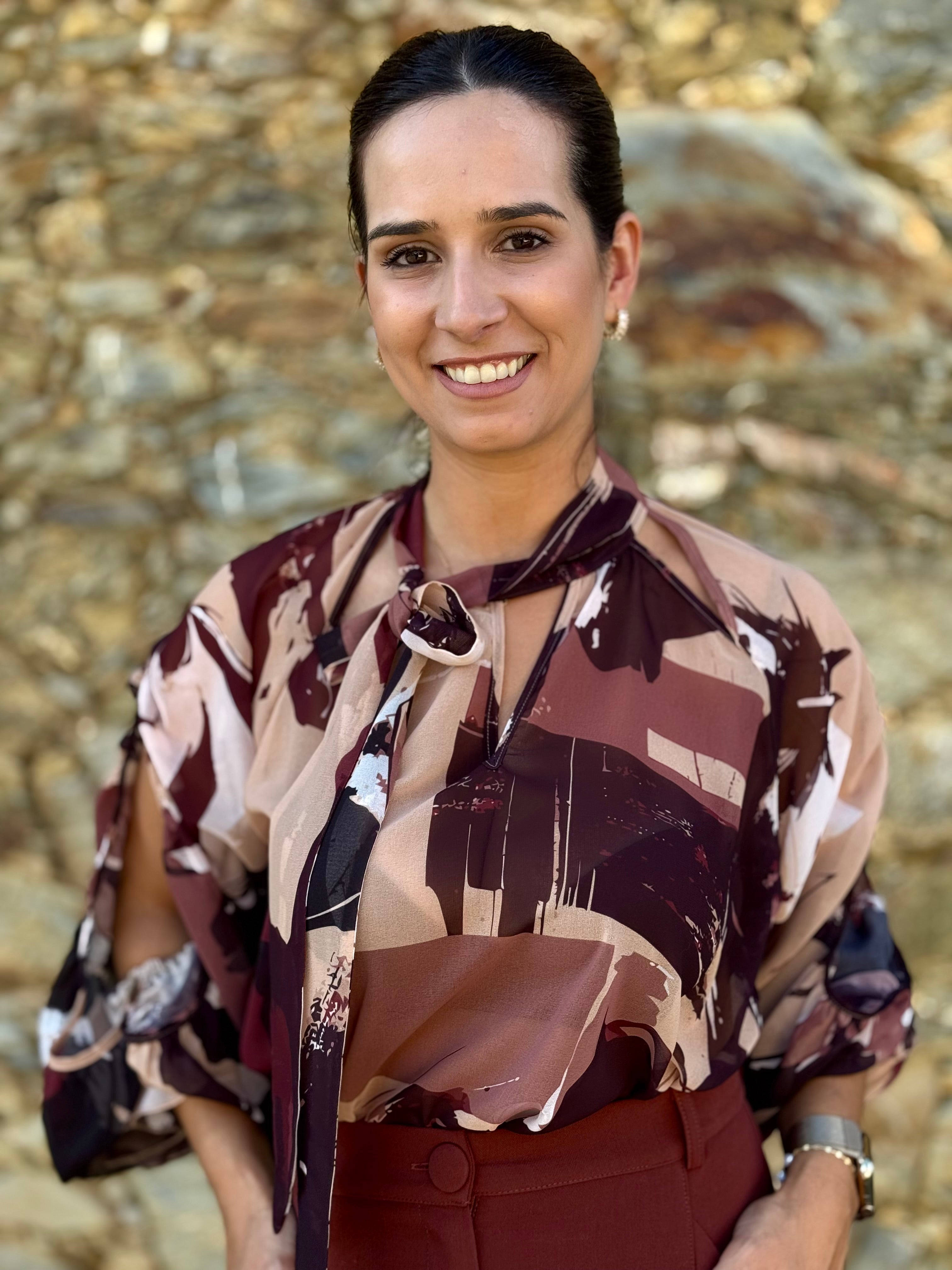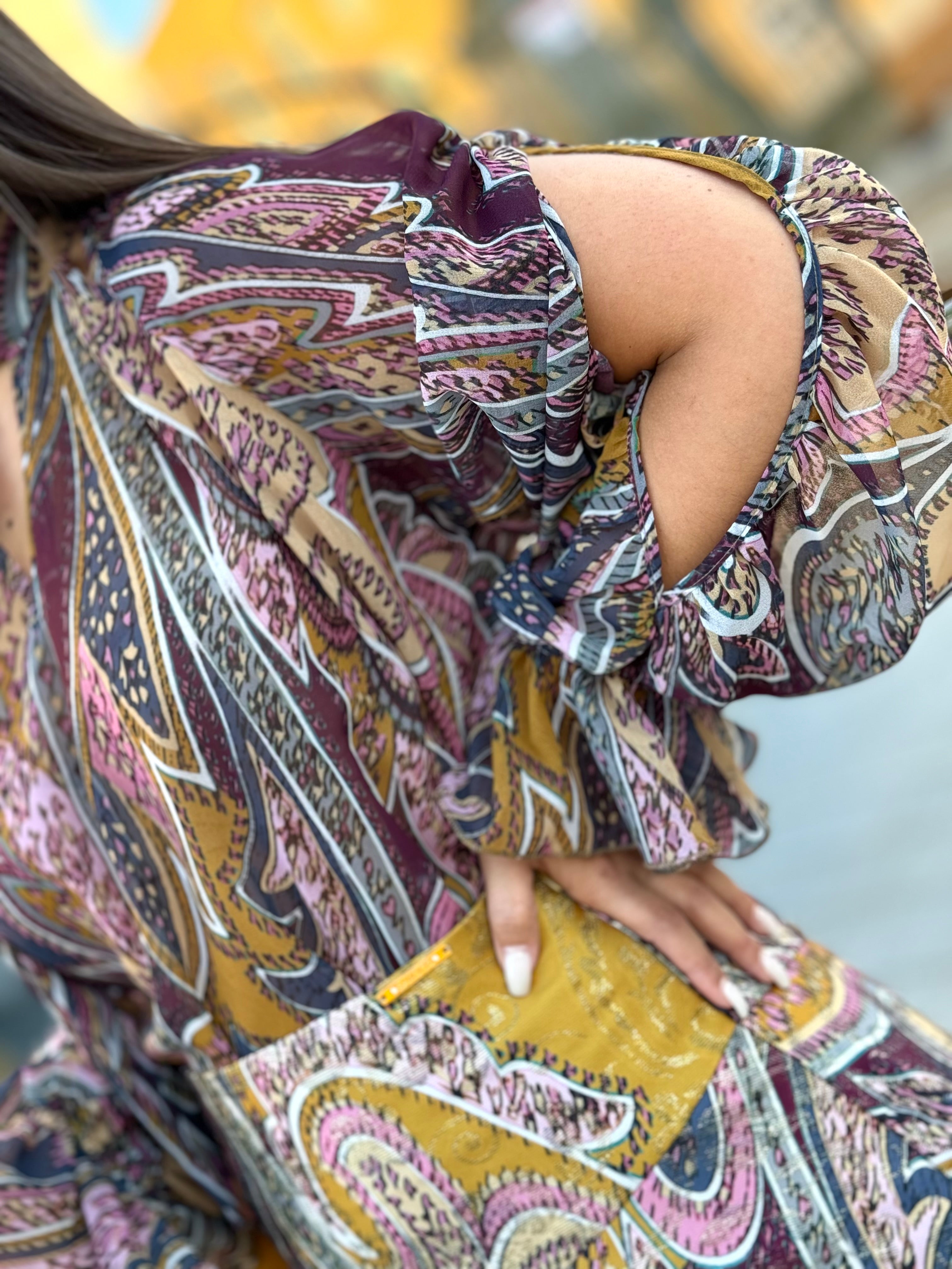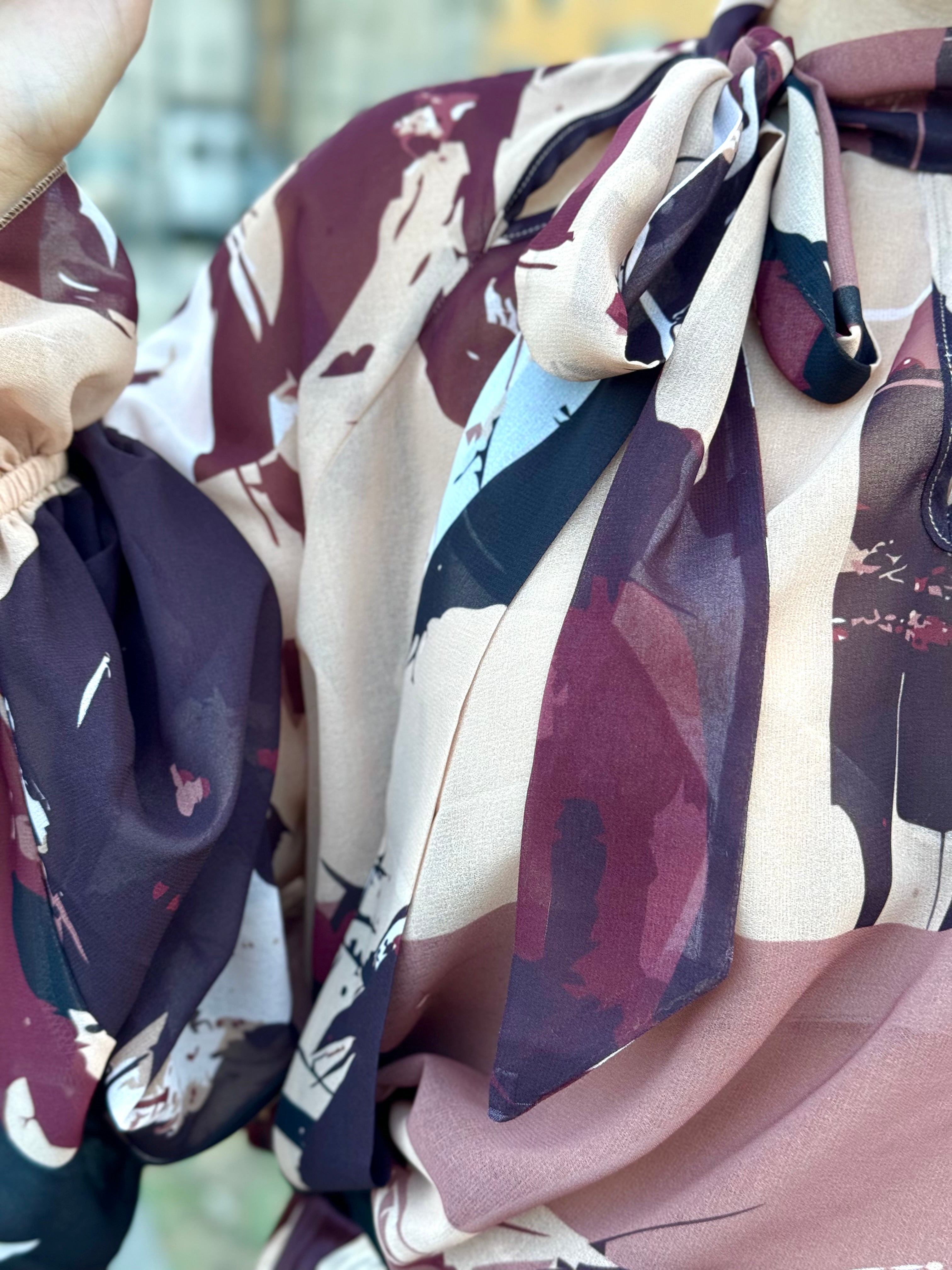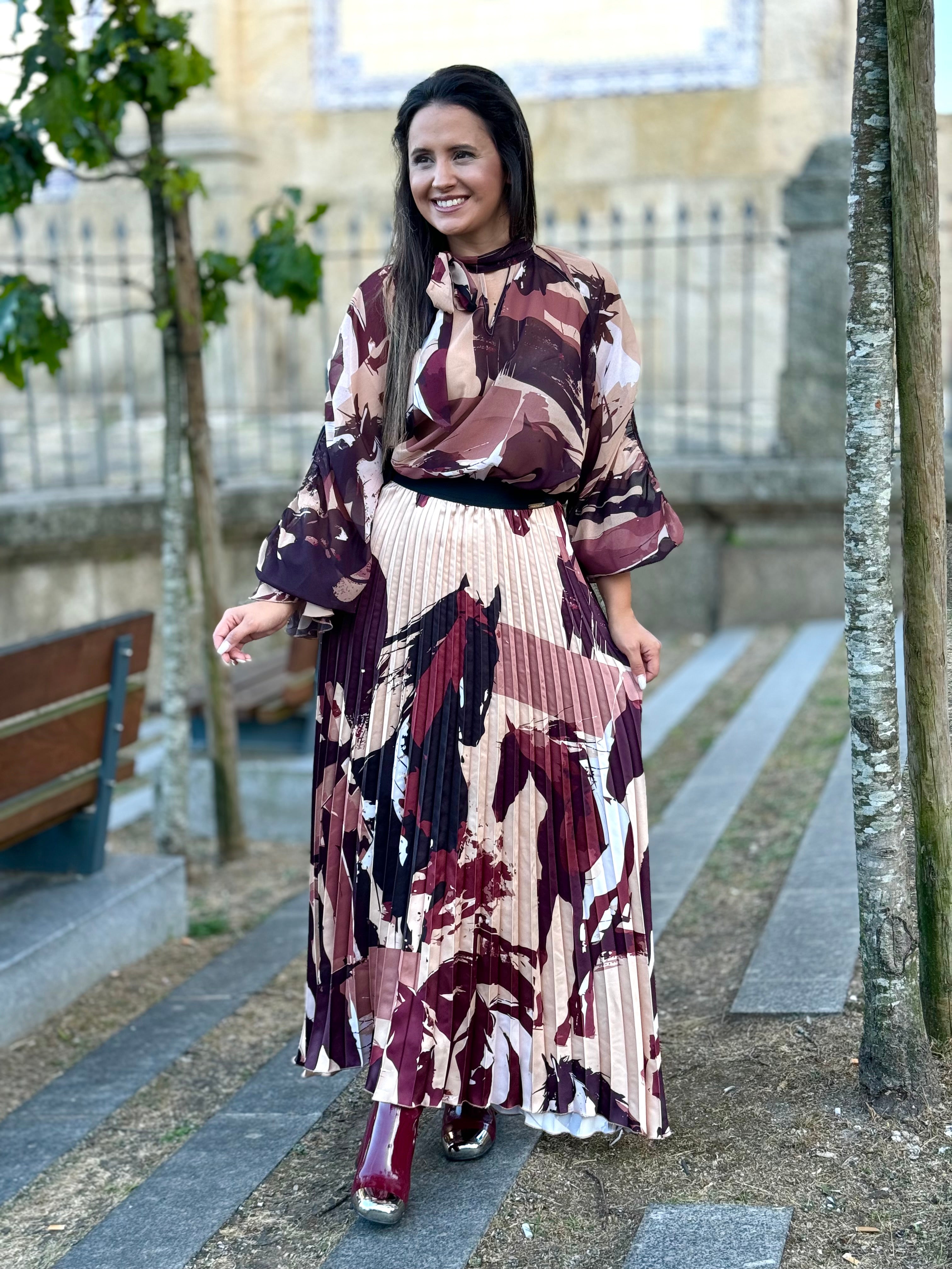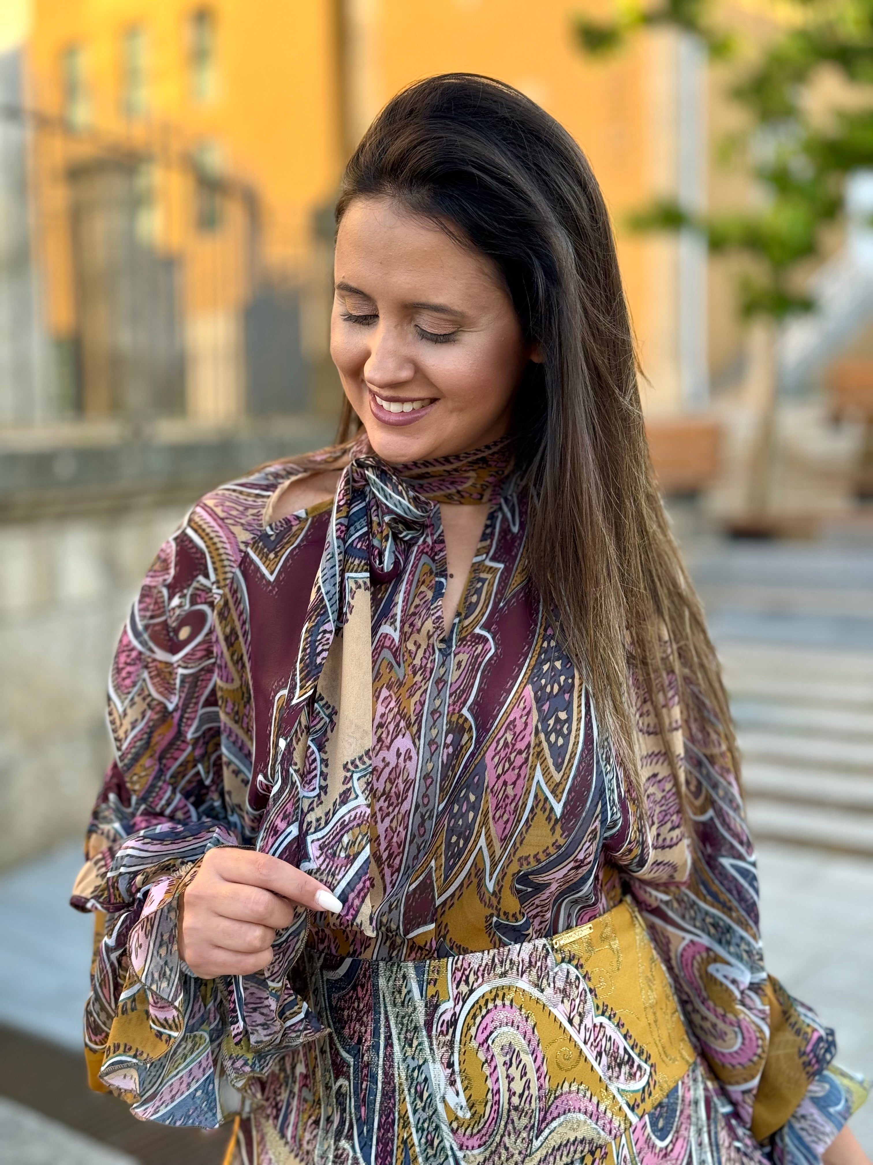 Blusa fluida c/ decote aberto e laço no pescoço. Com abertura na manga.
